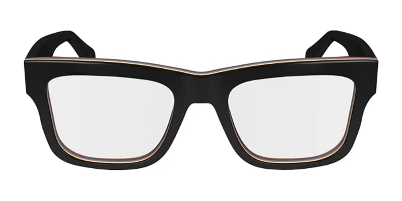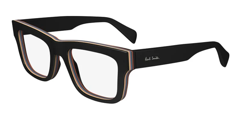 This square Paul Smith optical comes in a black with multi coloured stripes frame.