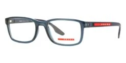 This rectangular Prada Linea Rossa optical comes in a blue crystal frame.