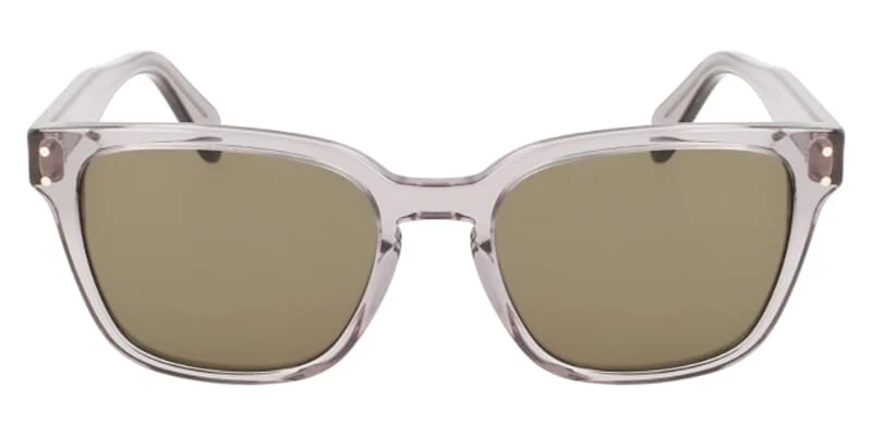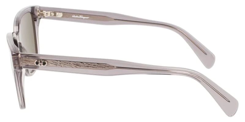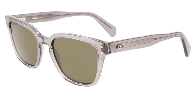 This square Salvatore Ferragamo sunglass comes in a transparent grey frame with green lenses.