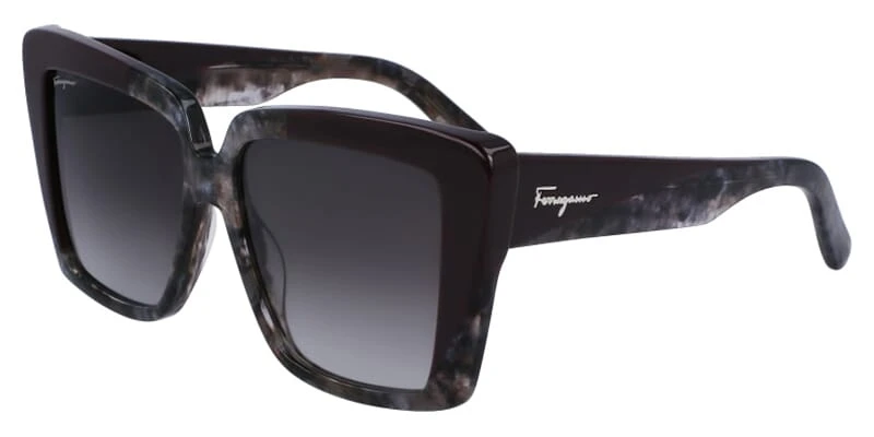 This square Salvatore Ferragamo sunglass comes in a grey marble and bordeaux frame with grey lenses.