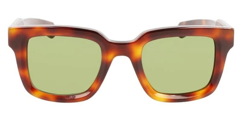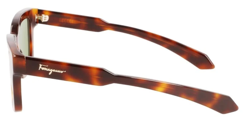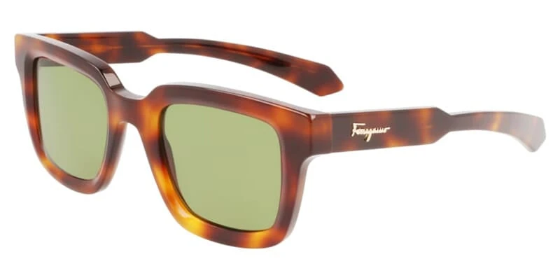 This square Salvatore Ferragamo sunglass comes in a tortoise frame with green lenses.