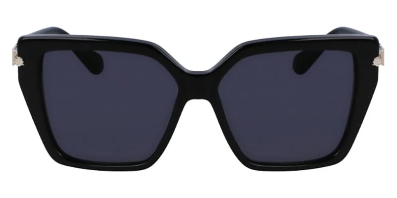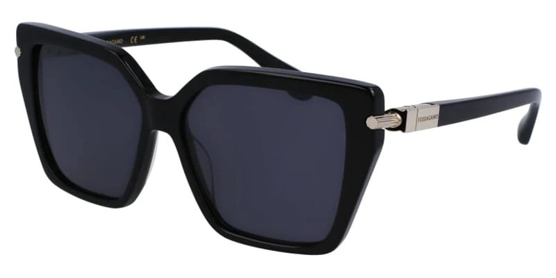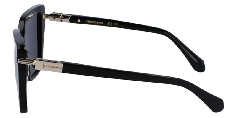 This square Salvatore Ferragamo sunglass comes in a black frame with grey lenses.