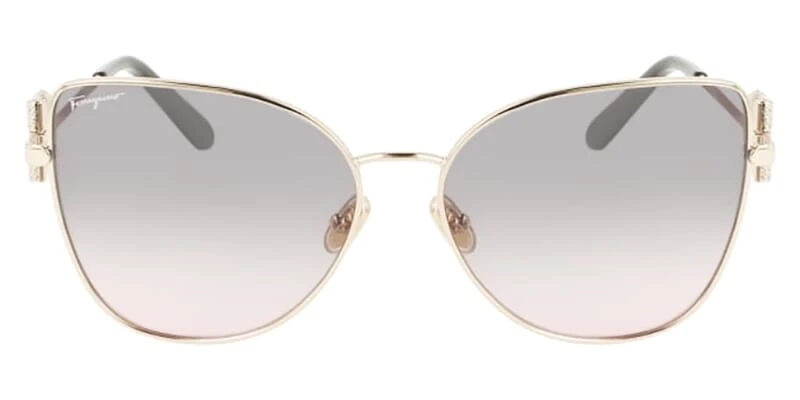 This cat eye Salvatore Ferragamo sunglass comes in a gold frame with grey gradient lenses.