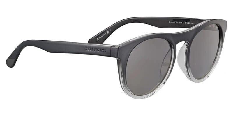 This square Serengeti sunglass comes in a shiny black to clear frame with saturn polarized smoke cat 2 to 3 b4 lenses.