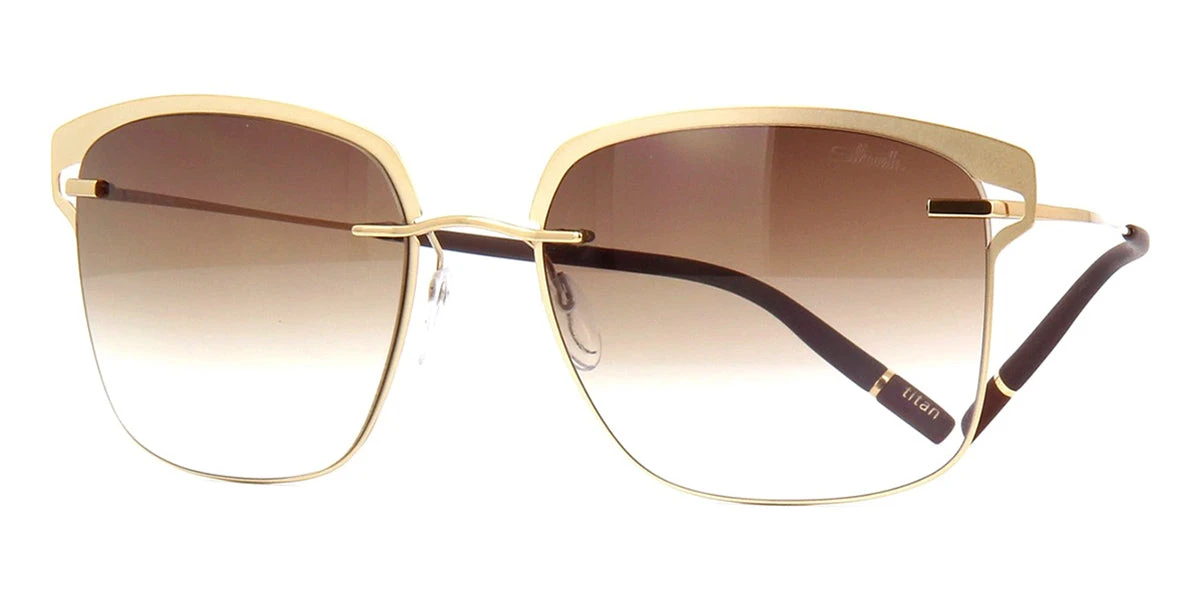 This square Silhouette sunglass comes in a gold and dark brown frame with brown gradient lenses.