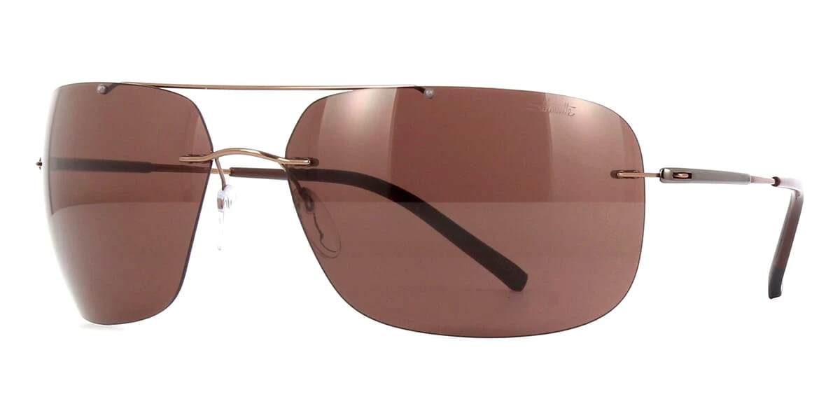 This wraparound Silhouette sunglass comes in a bronze and titanium frame with slm brown lenses.