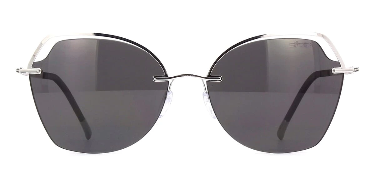 This cat eye Silhouette sunglass comes in a 23kt white gold plated and matte black rubber frame with grey with light mirror polarised lenses.