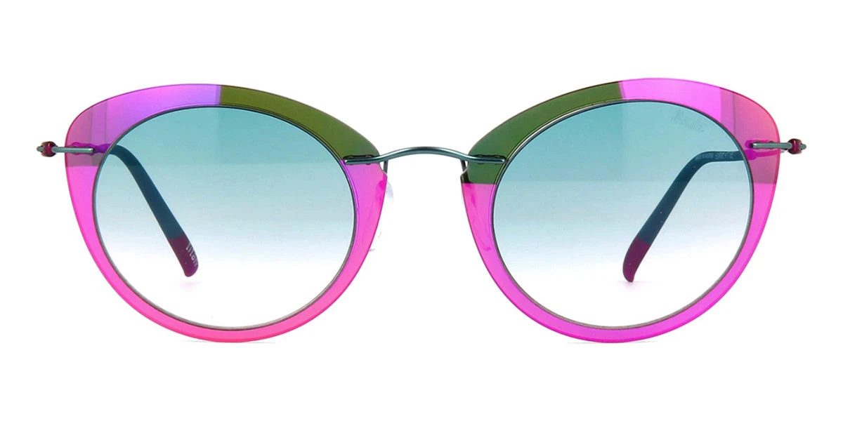 This cat eye Silhouette sunglass comes in a cyan and violet frame with blue gradient lenses.