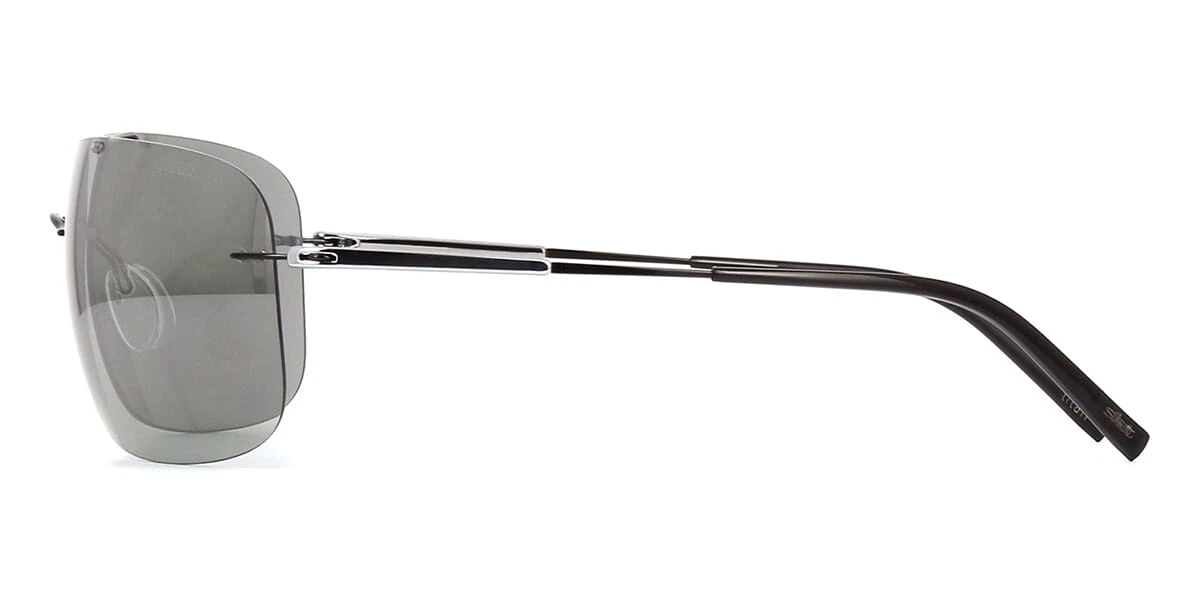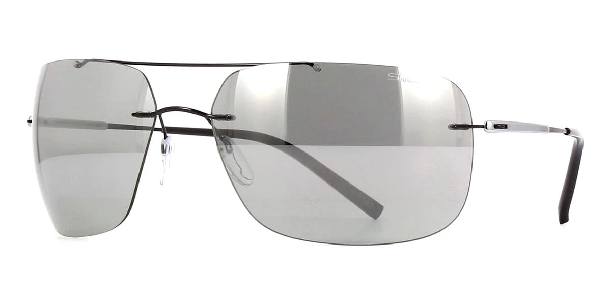 This square Silhouette sunglass comes in a black and silver frame with light grey with silver mirror lenses.