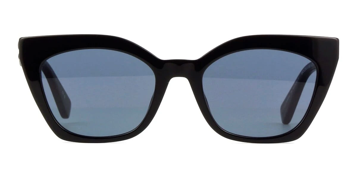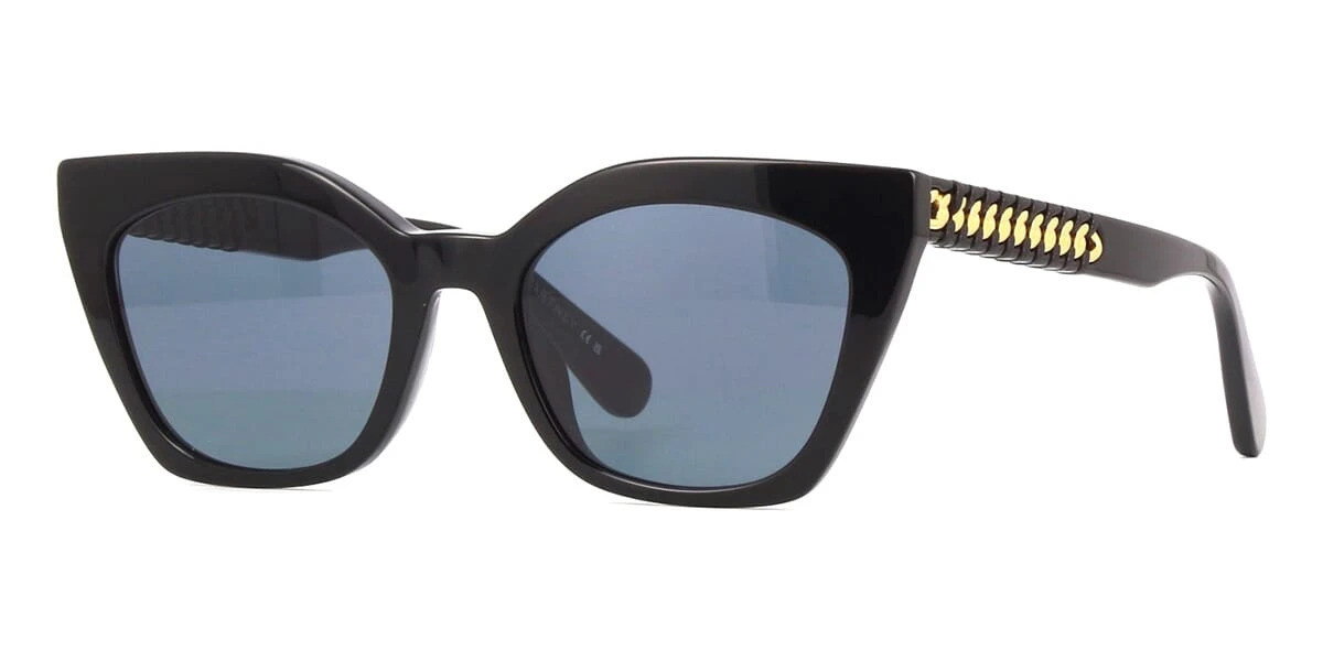 This cat eye Stella McCartney sunglass comes in a shiny black with gold frame with light blue lenses.
