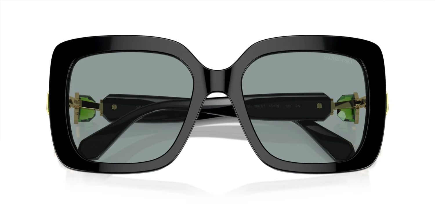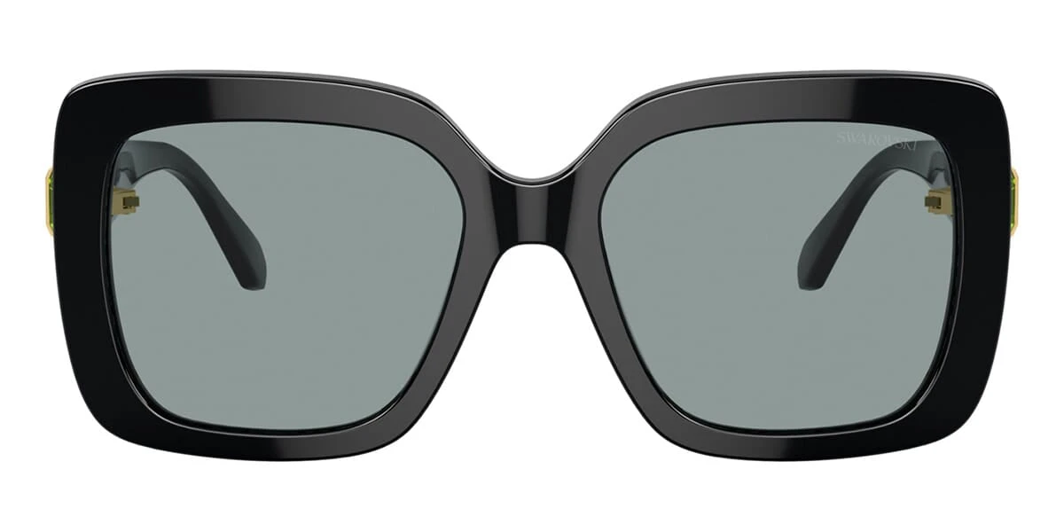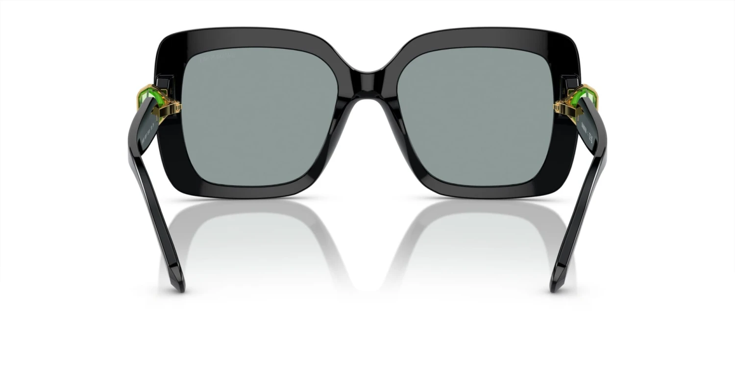 This square Swarovski sunglass comes in a black frame with dark grey lenses.
