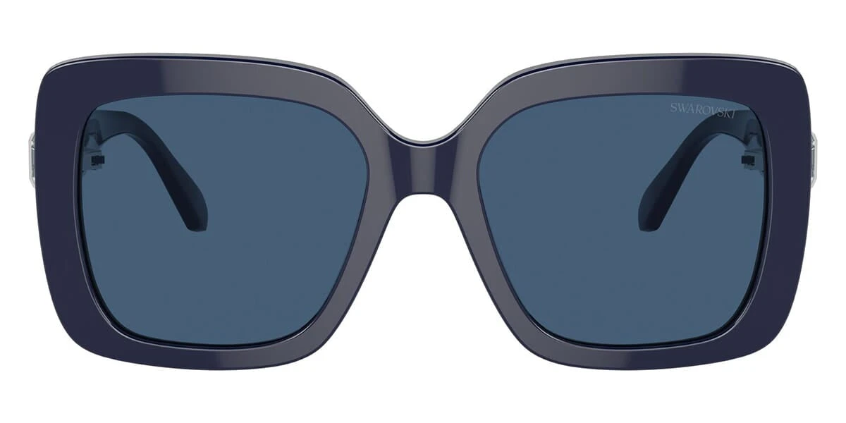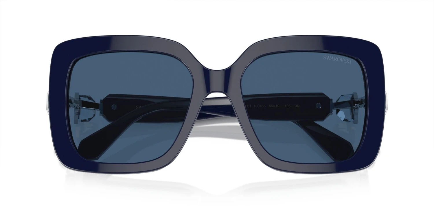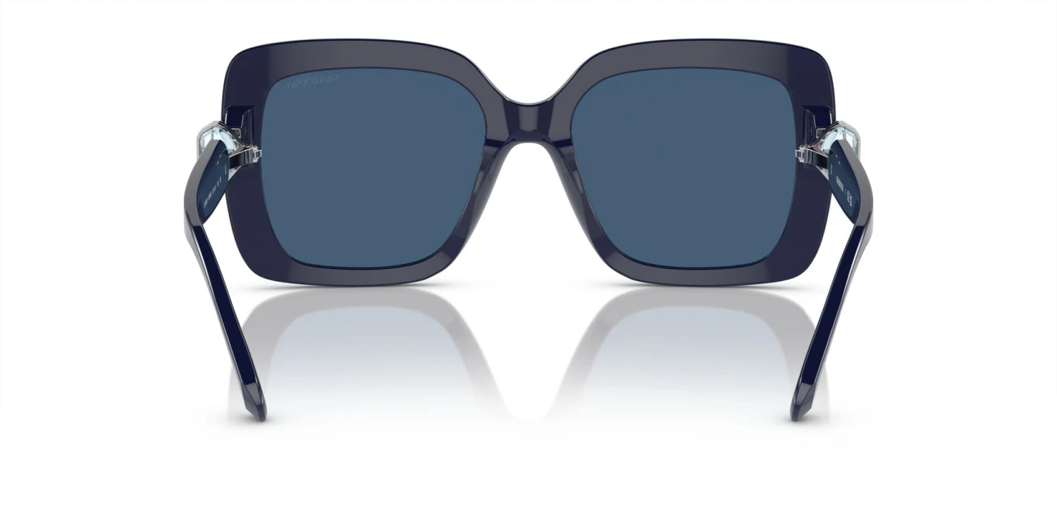 This square Swarovski sunglass comes in a opal blue frame with dark blue lenses.