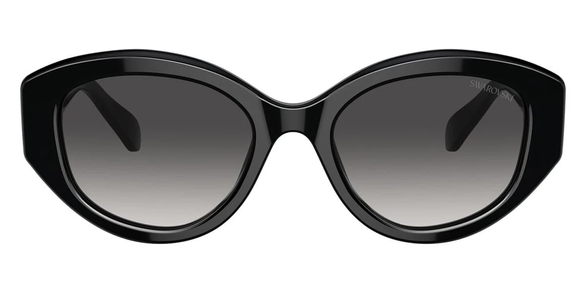 This cat eye Swarovski sunglass comes in a black frame with grey gradient lenses.
