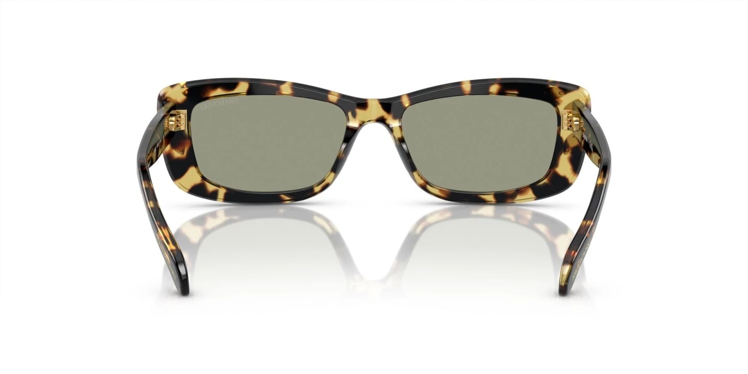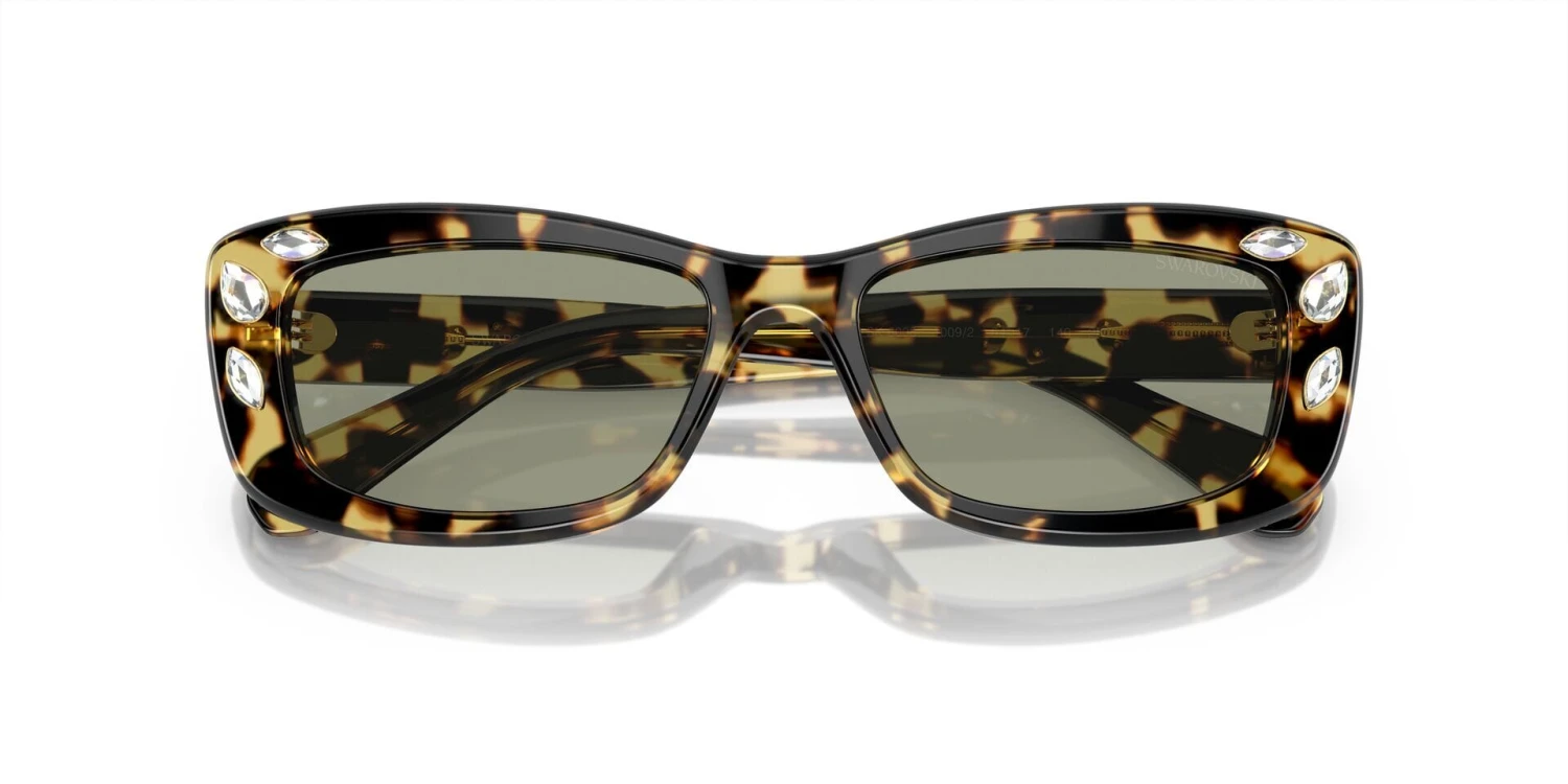 This rectangular Swarovski sunglass comes in a medium havana frame with green lenses.
