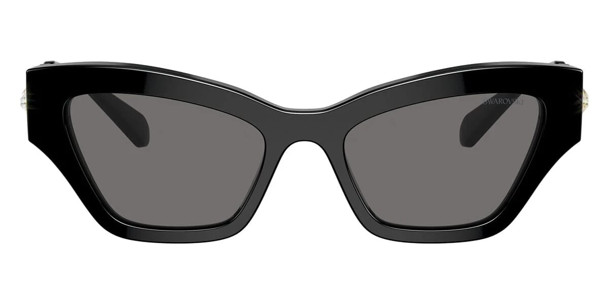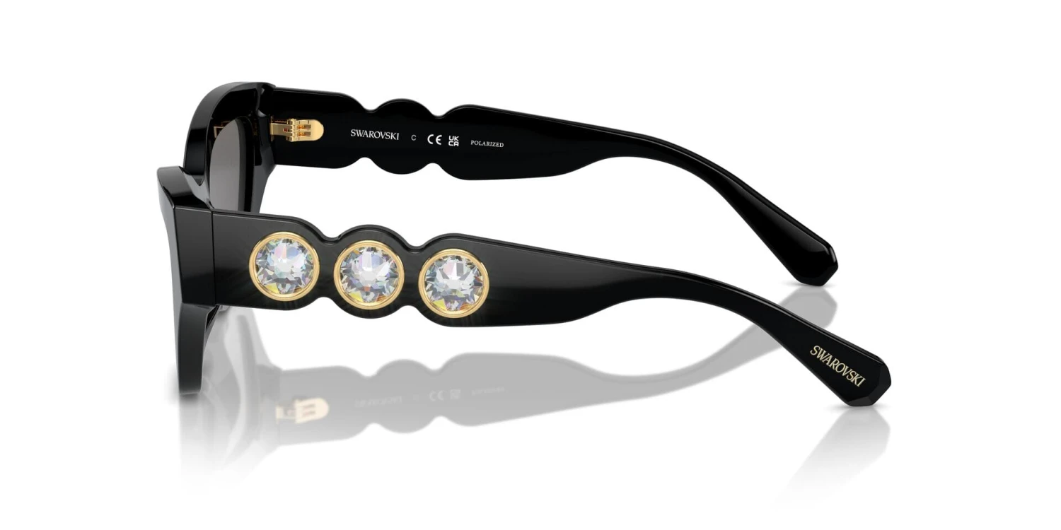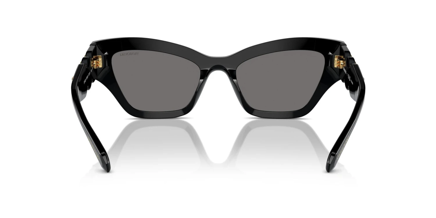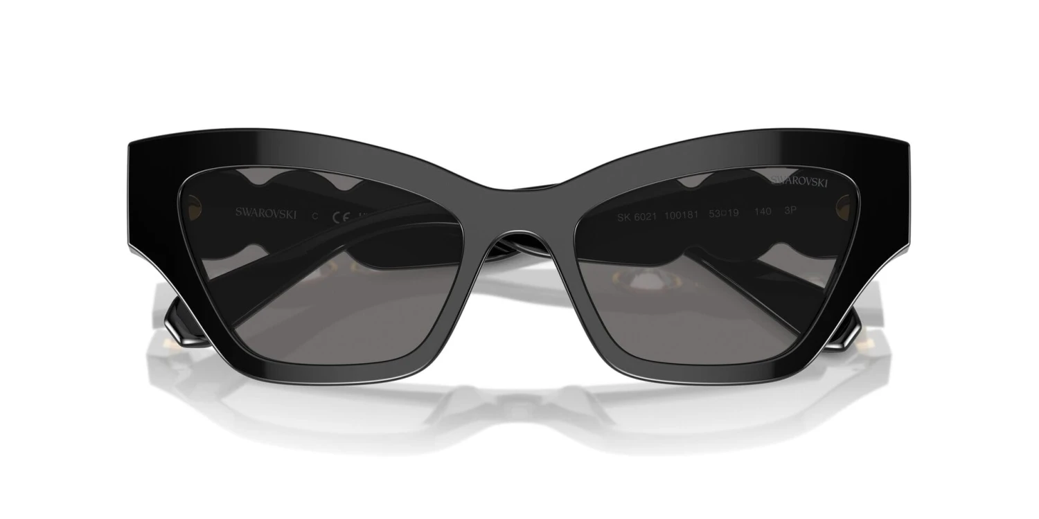 This cat eye Swarovski sunglass comes in a black frame with dark grey polarised lenses.