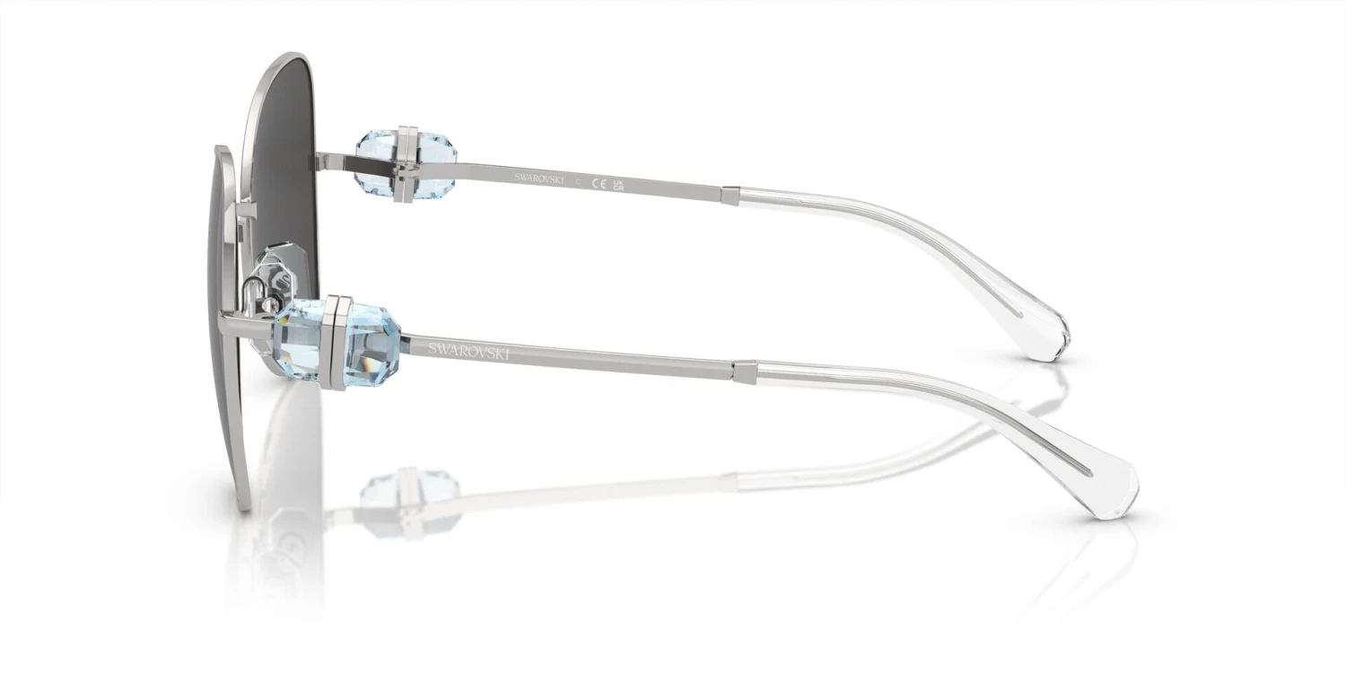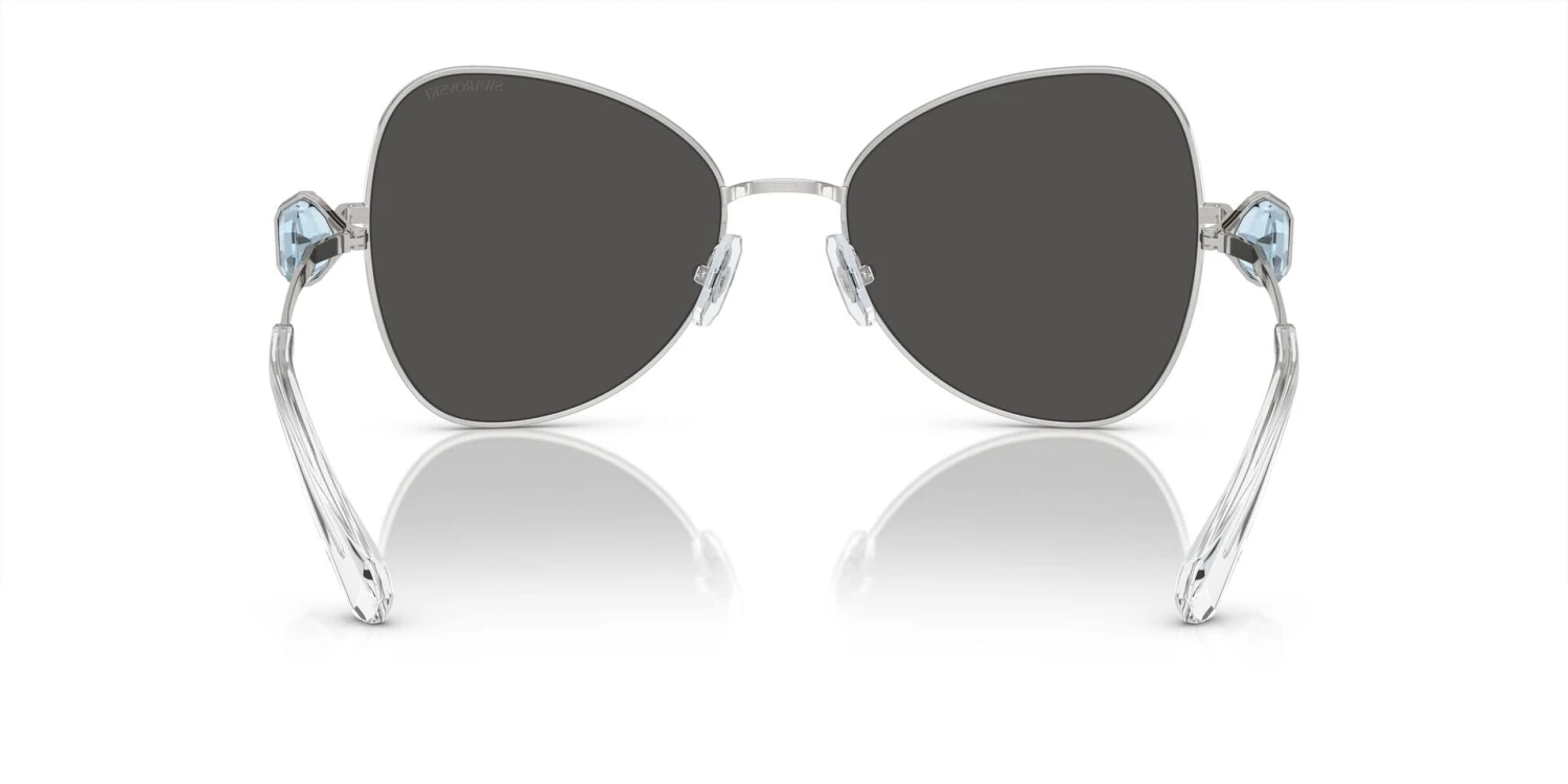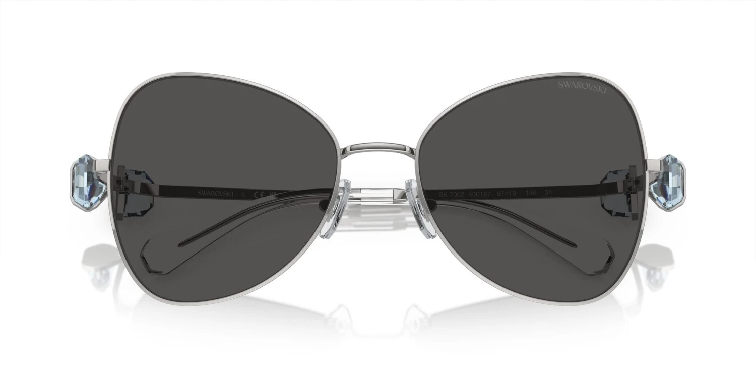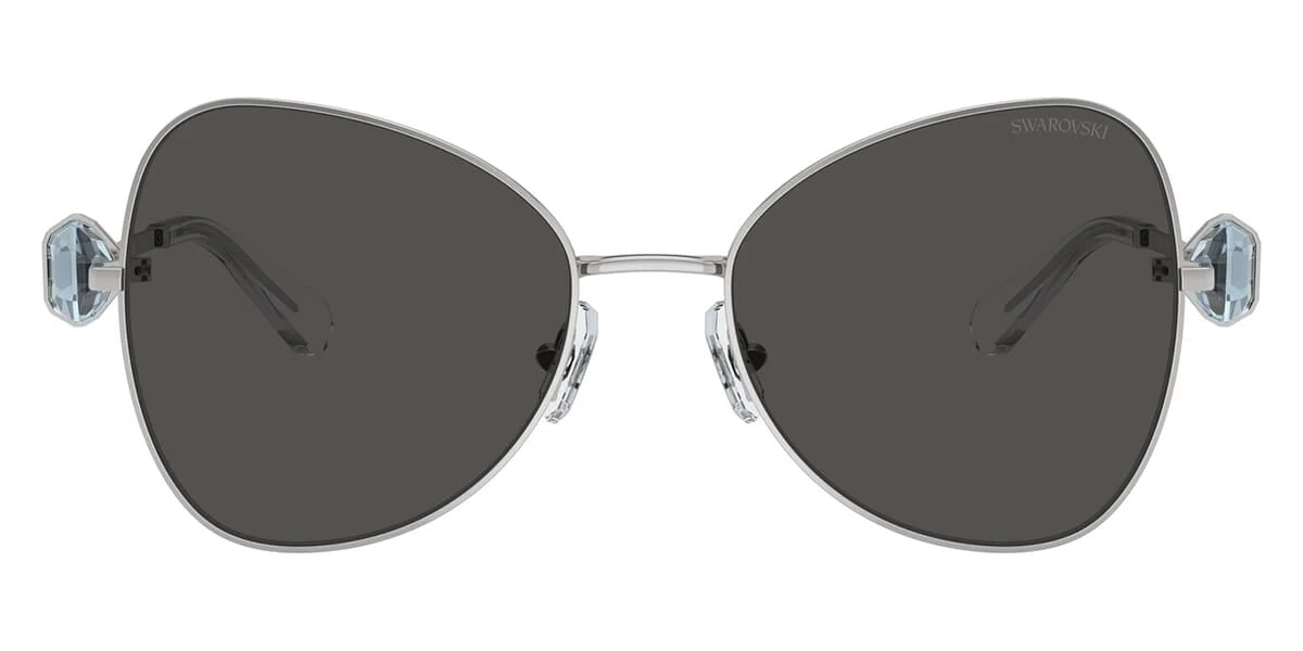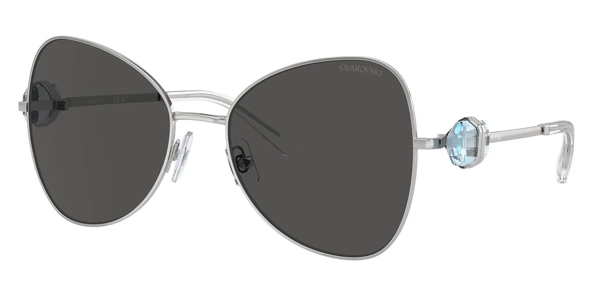 This butterfly Swarovski sunglass comes in a silver frame with dark grey lenses.
