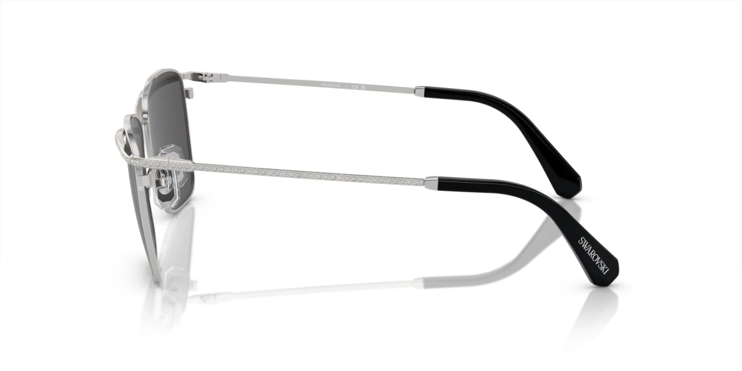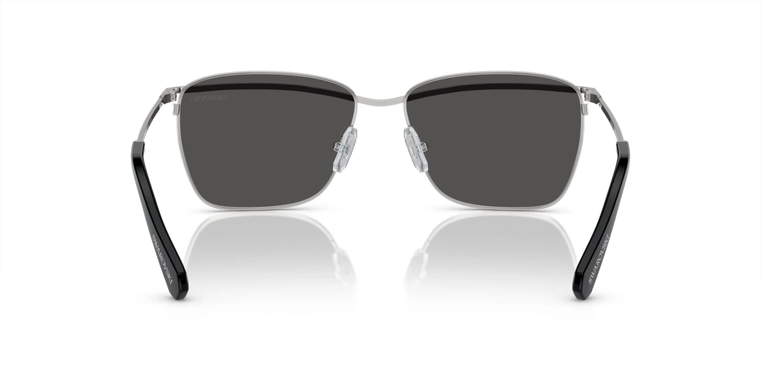 This square Swarovski sunglass comes in a silver frame with dark grey lenses.