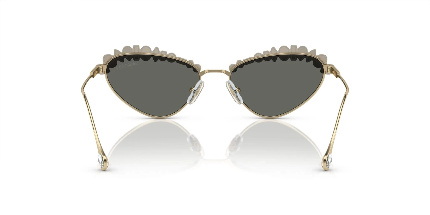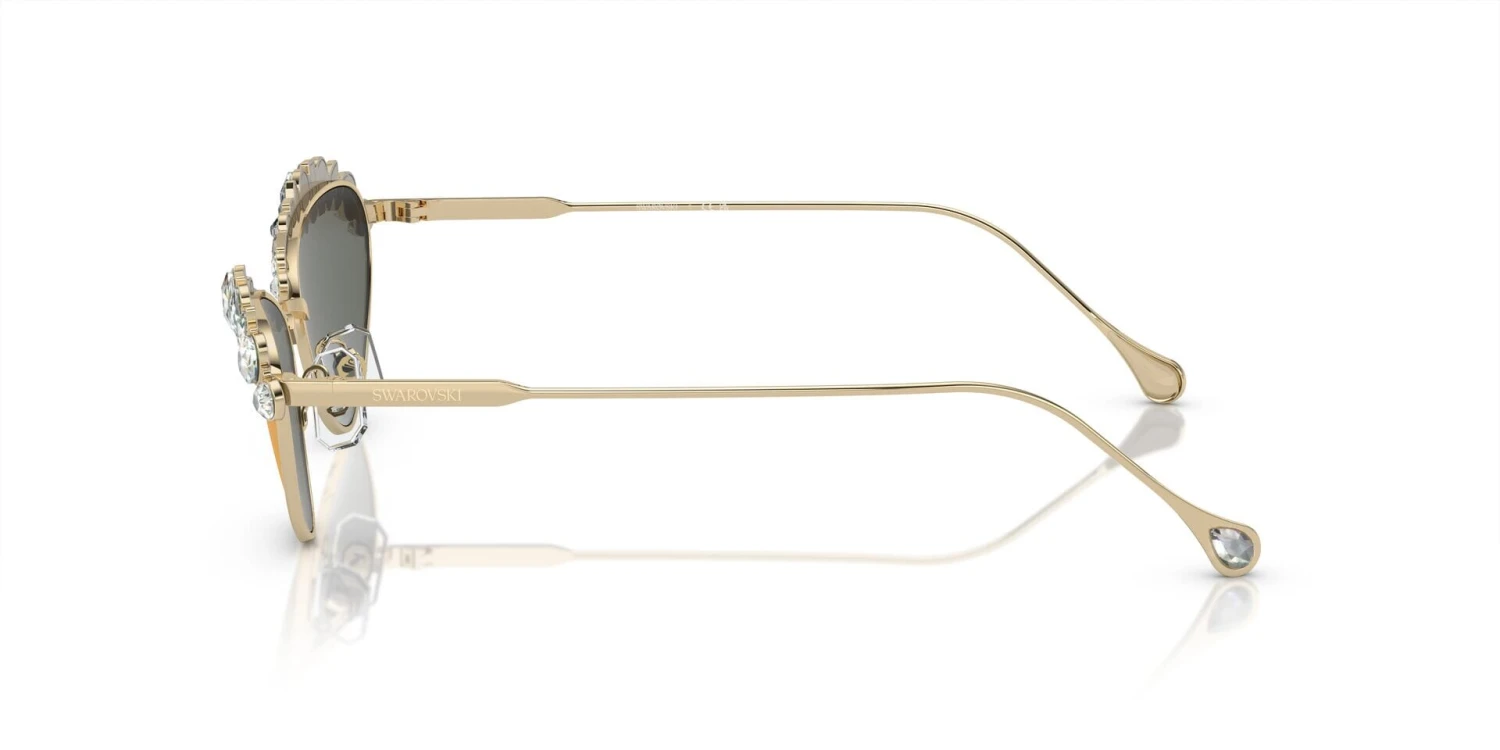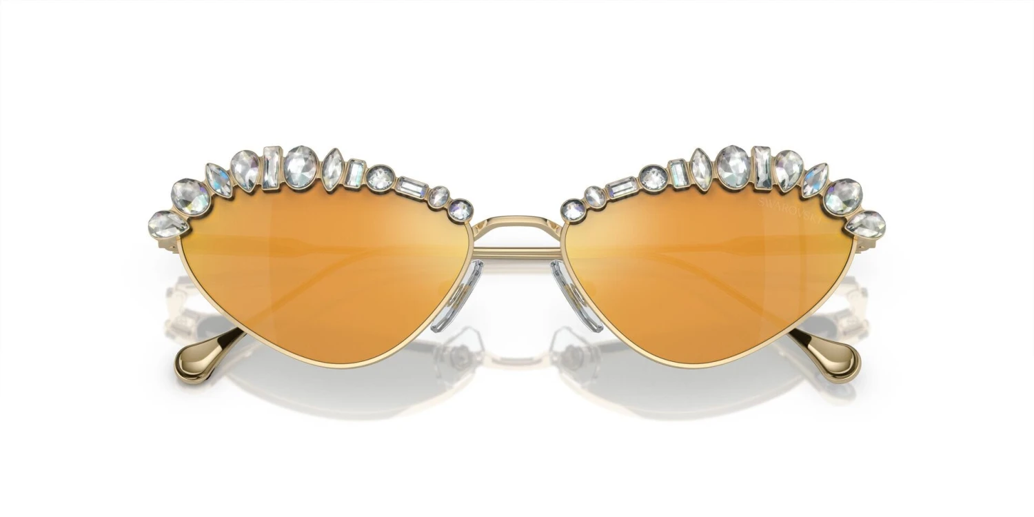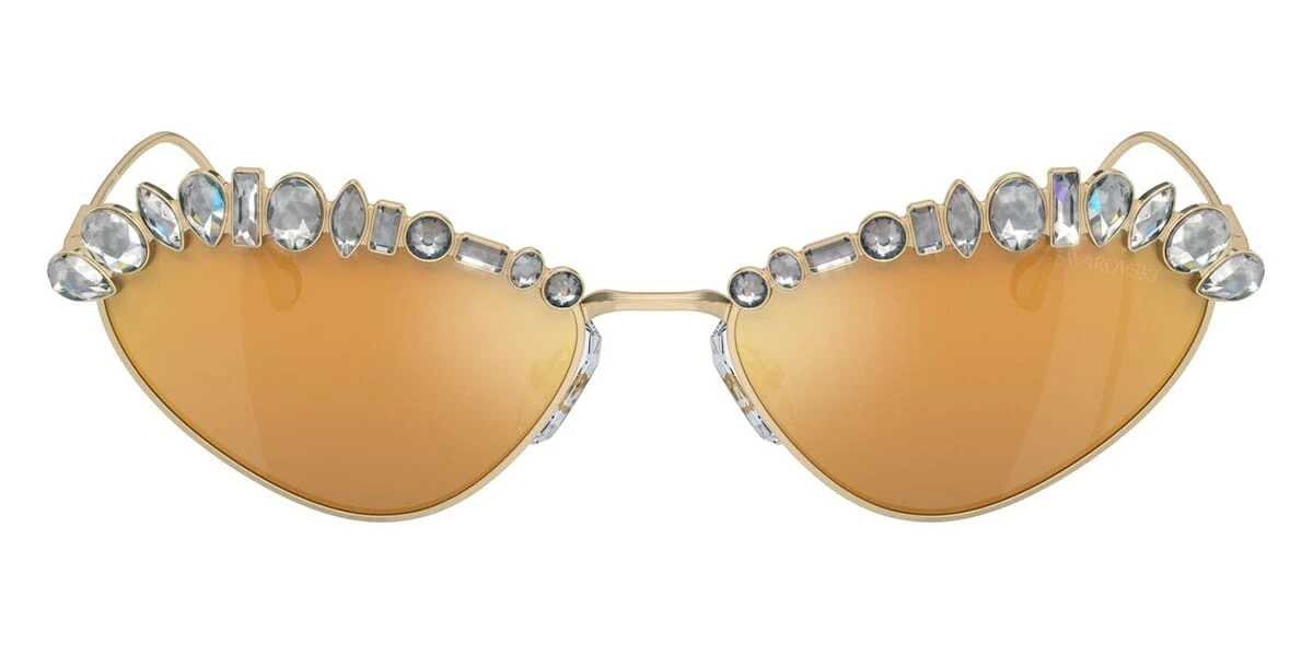 This cat eye Swarovski sunglass comes in a pale gold frame with brown with gold mirror lenses.