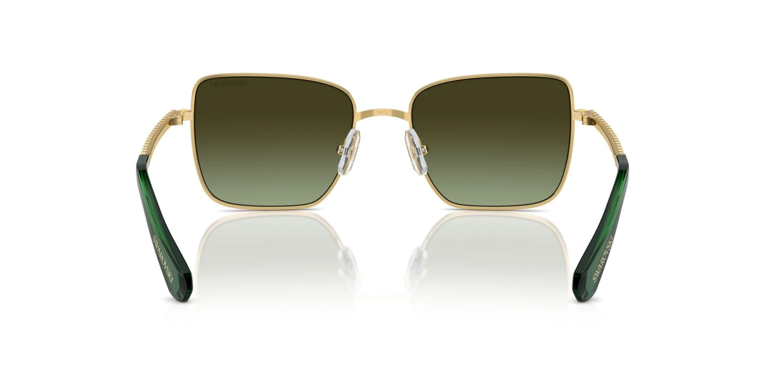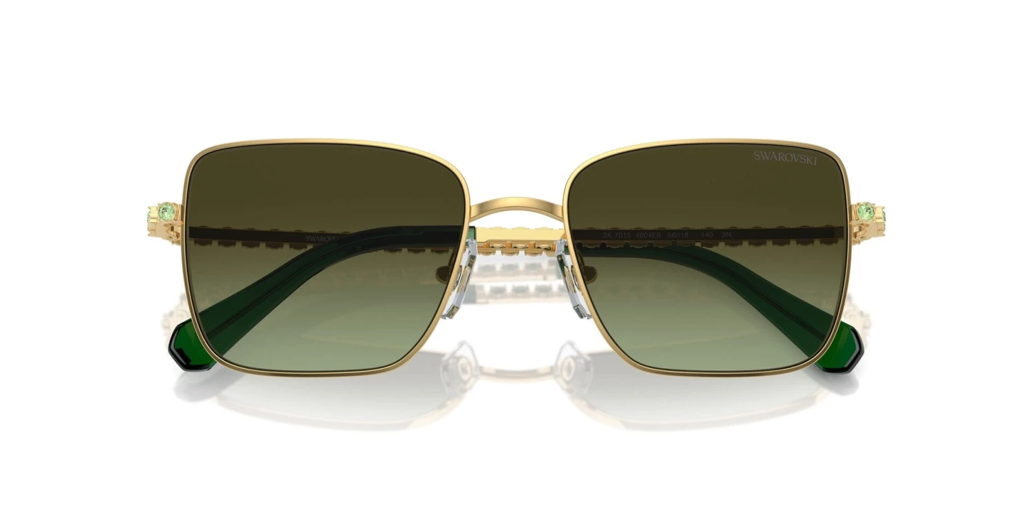 This square Swarovski sunglass comes in a gold frame with green gradient brown lenses.