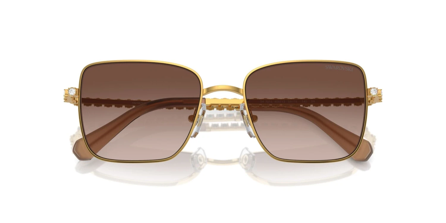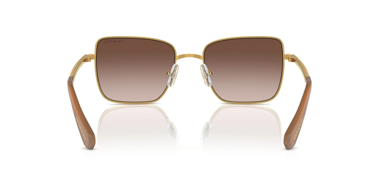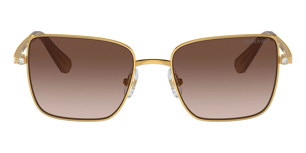 This round Swarovski sunglass comes in a yellow gold frame with brown gradient lenses.