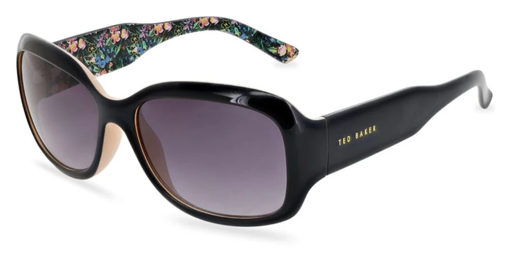 This square Ted Baker sunglass comes in a black with nude pink frame with grey gradient lenses.
