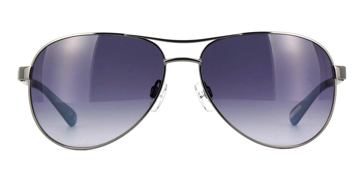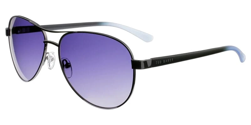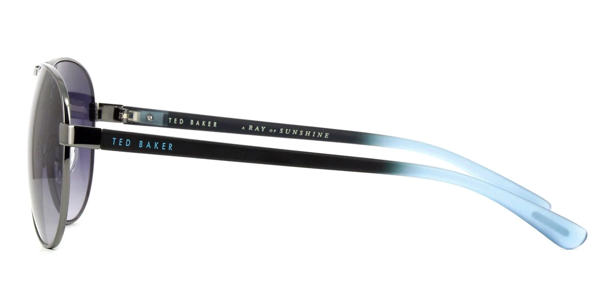 This aviator Ted Baker sunglass comes in a dark gunmetal frame with blue lenses.