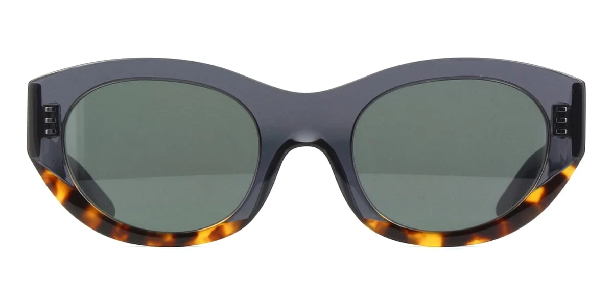 This cat eye Thierry Lasry sunglass comes in a grey crystal and havana frame with grey with light mirror lenses.