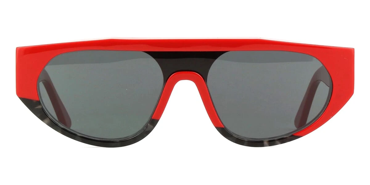 This round Thierry Lasry sunglass comes in a shiny red with black frame with solid grey lenses.
