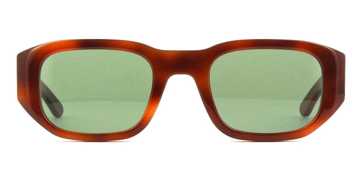This square Thierry Lasry sunglass comes in a shiny havana frame with green lenses.
