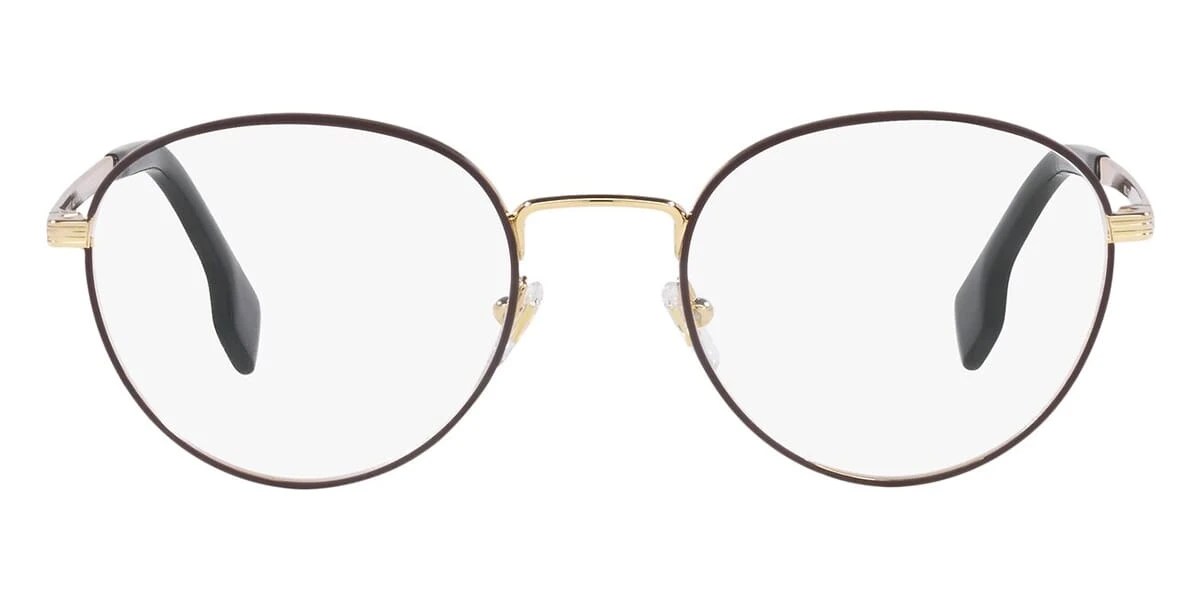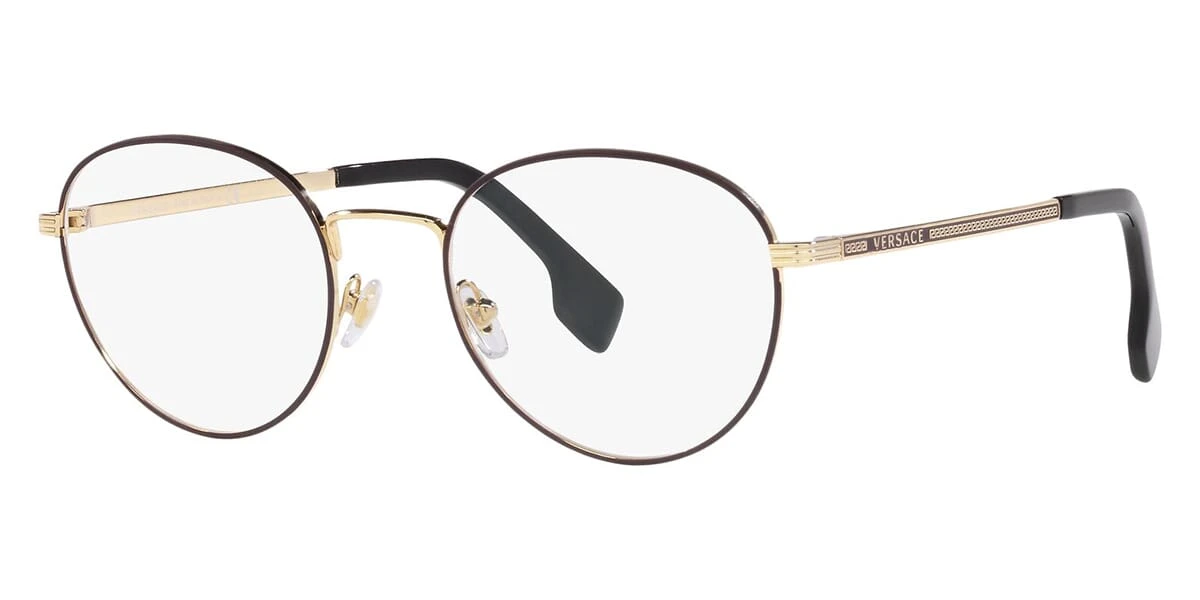 This round Versace optical comes in a matte bordeaux and gold frame.