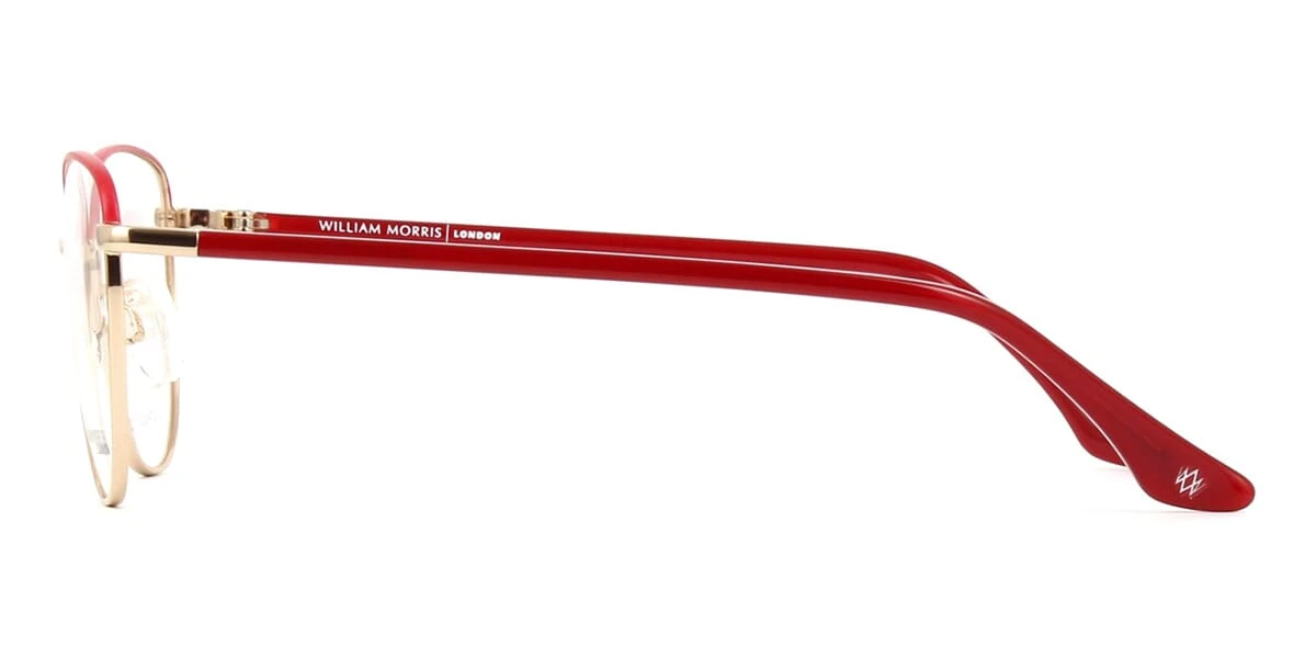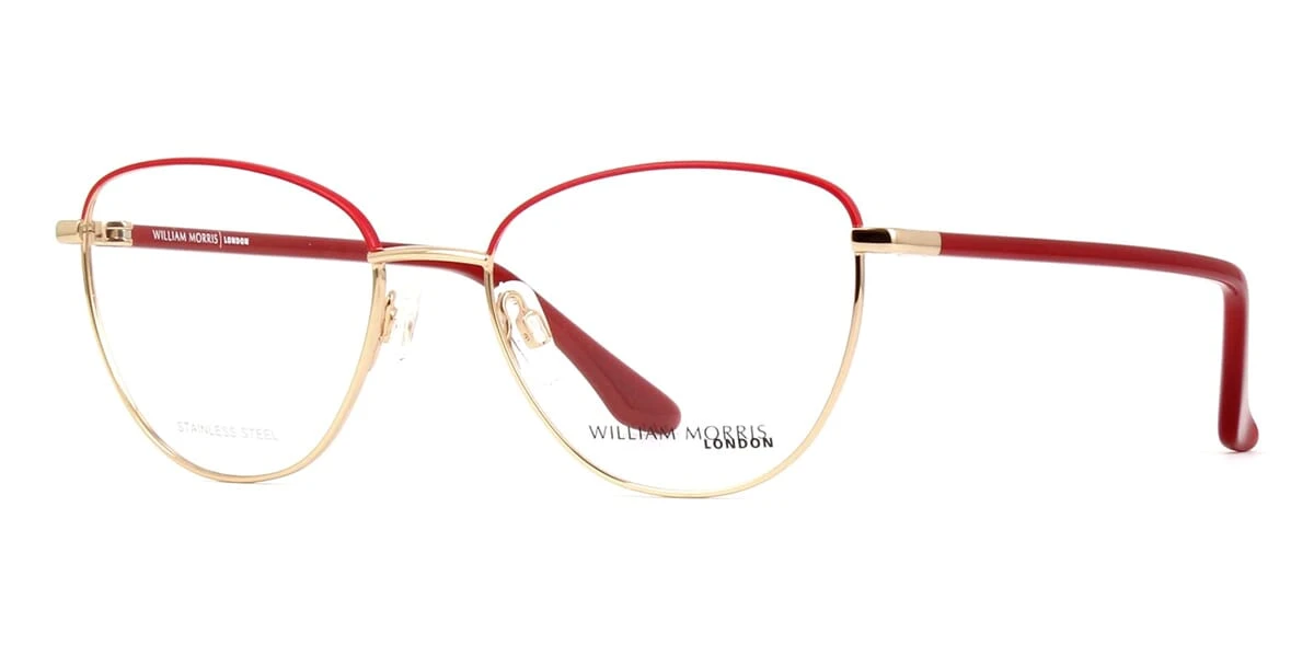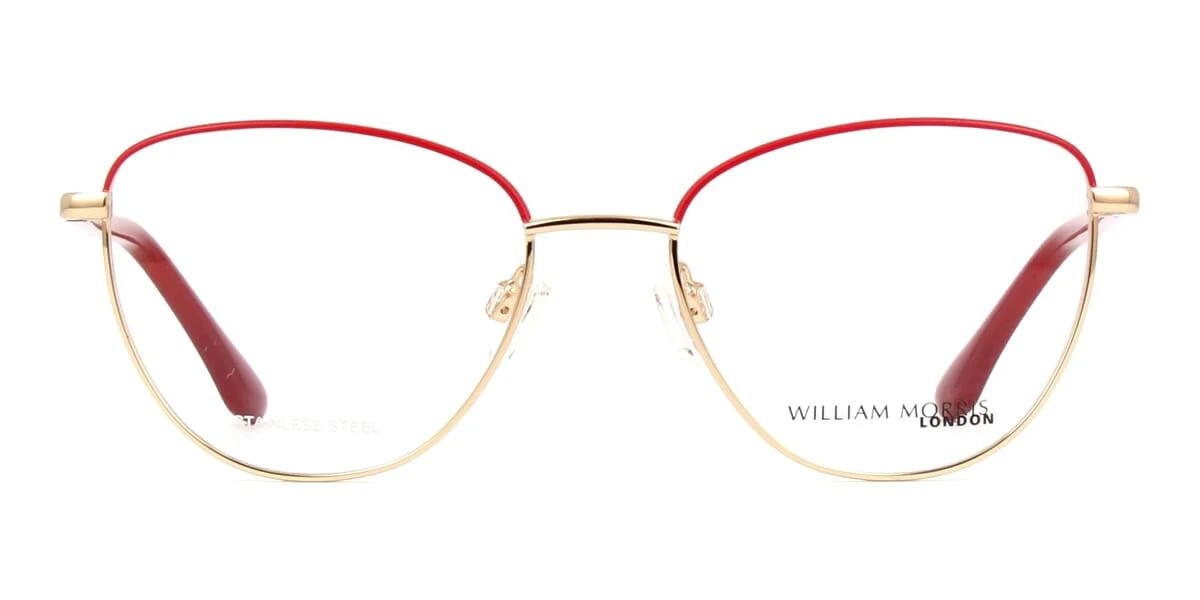This cat eye William Morris optical comes in a red with gold frame.