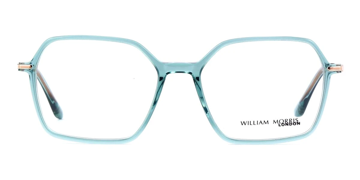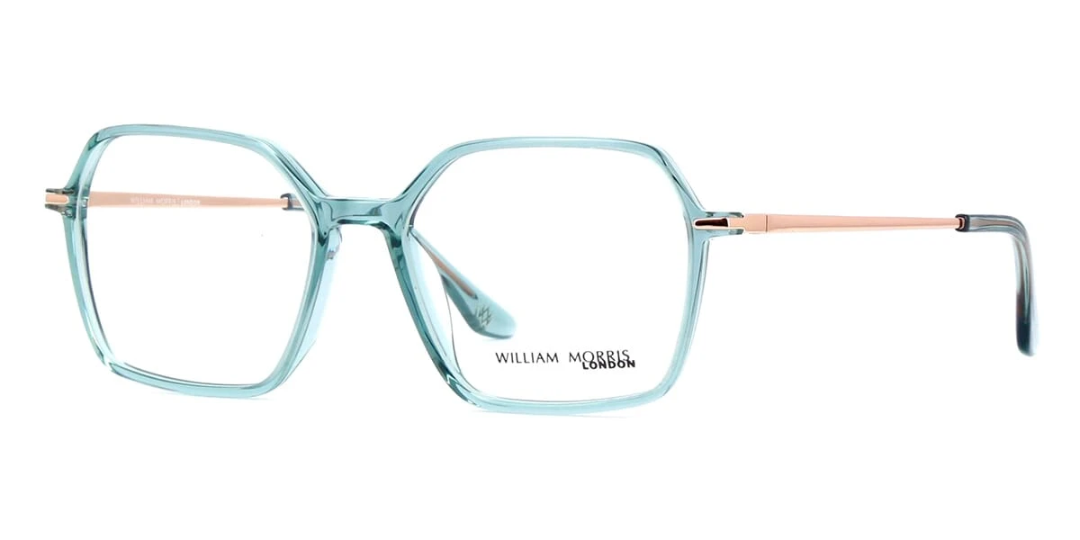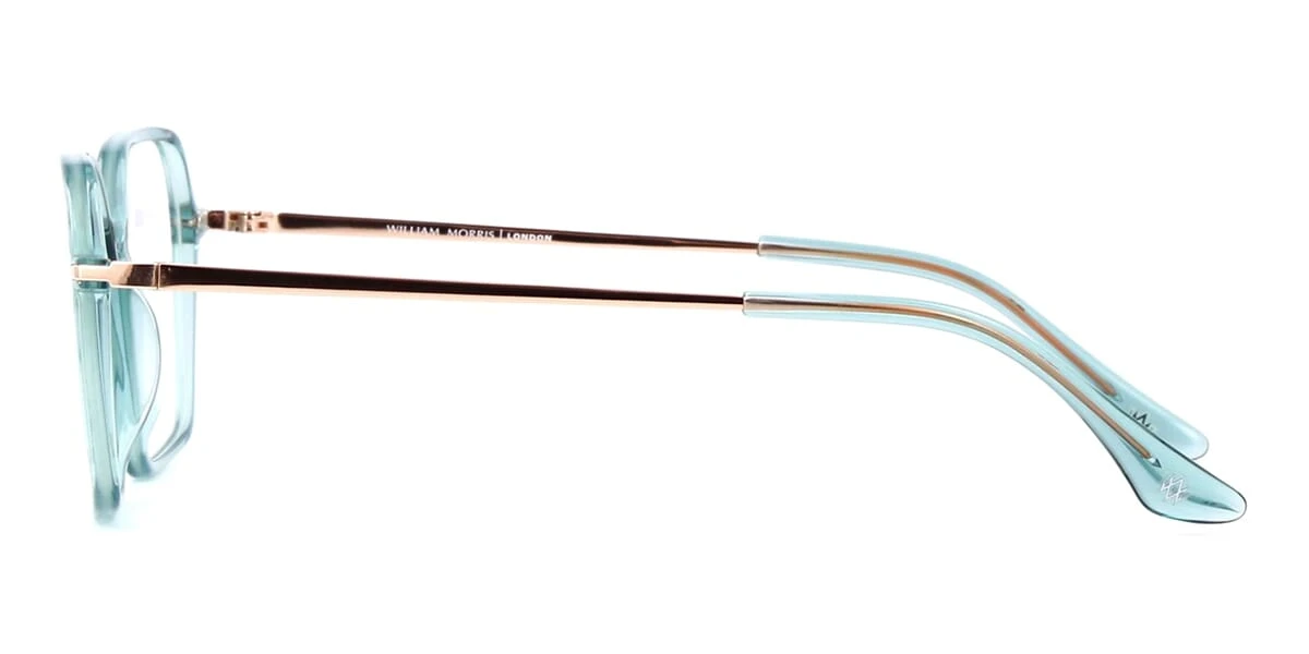 This square William Morris optical comes in a shiny light green crystal with gold frame.