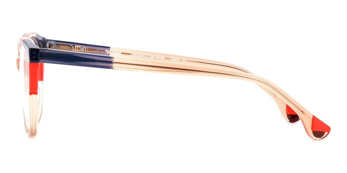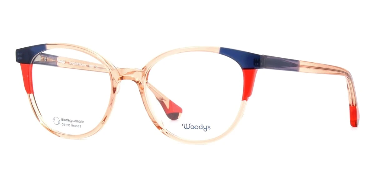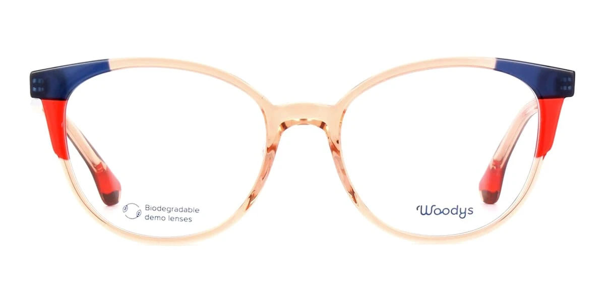 This square Woodys optical comes in a crystal peach with blue and red frame.