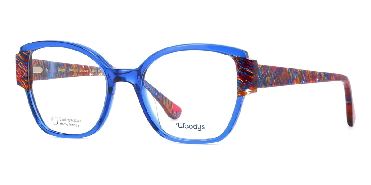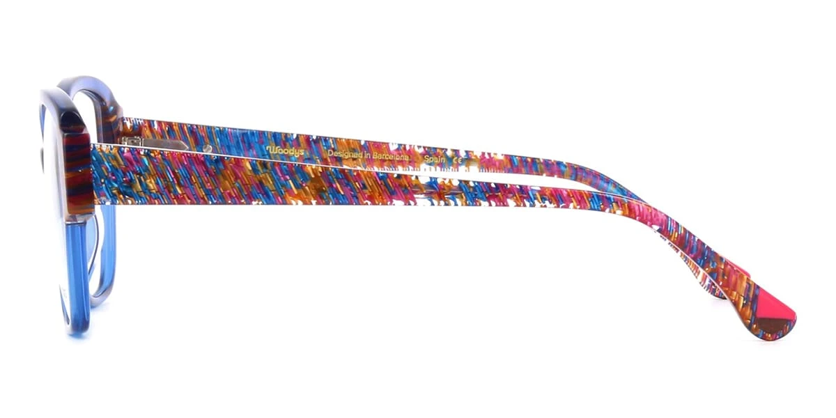 This square Woodys optical comes in a crystal blue with shiny rainbow havana frame.