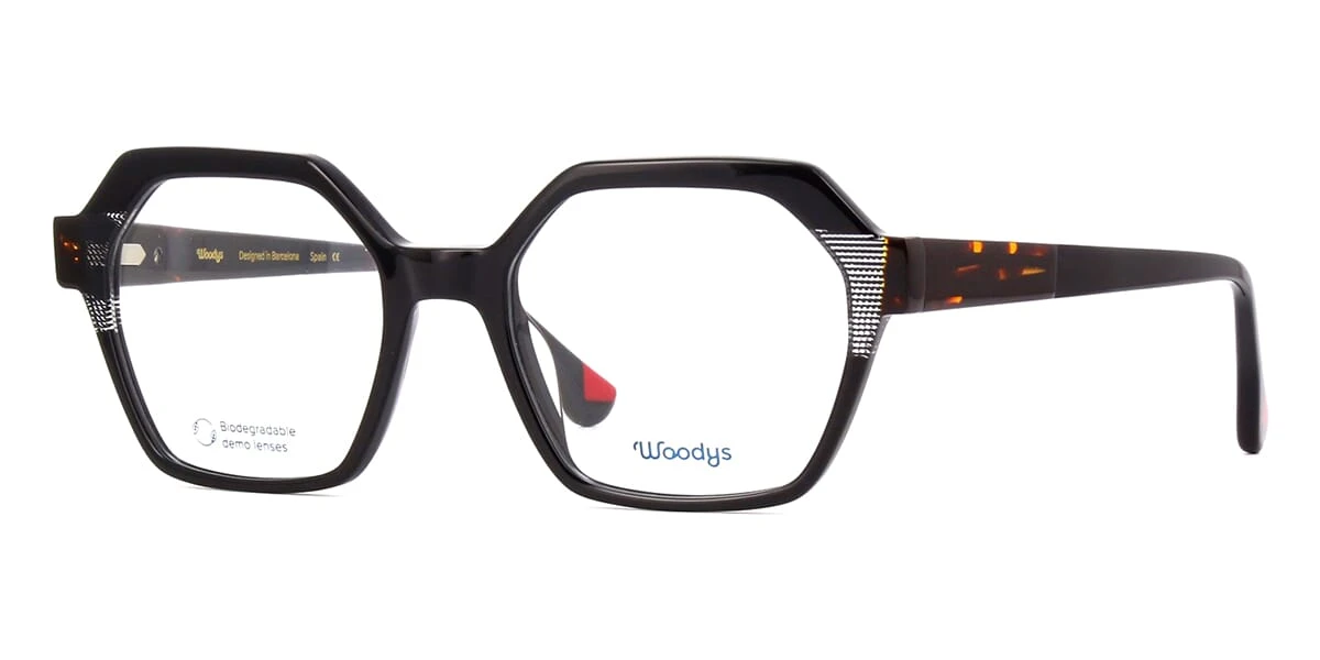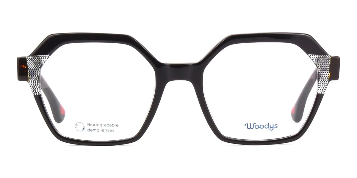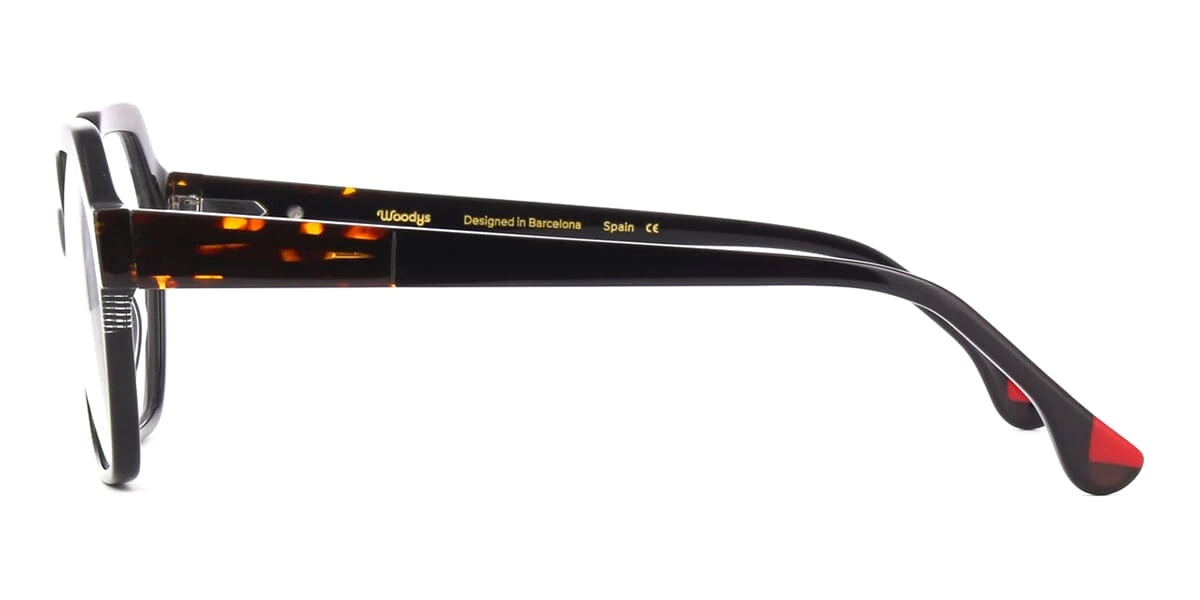 This square Woodys optical comes in a shiny black with havana frame.