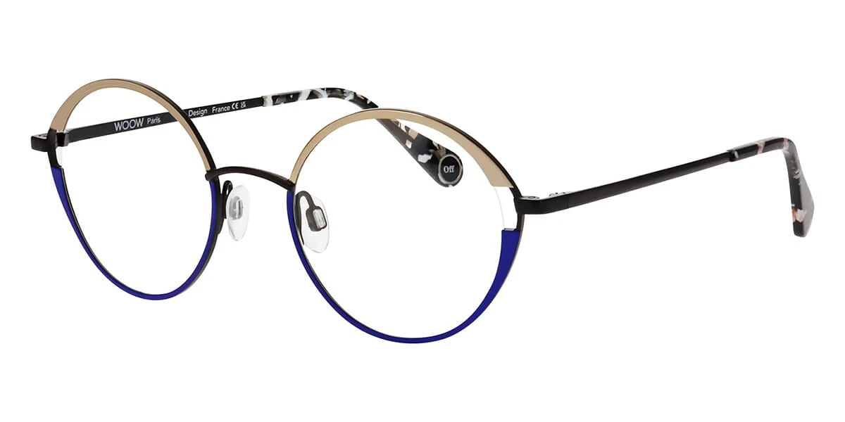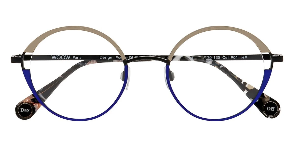 This round WooW optical comes in a shiny gold and matte blue frame.